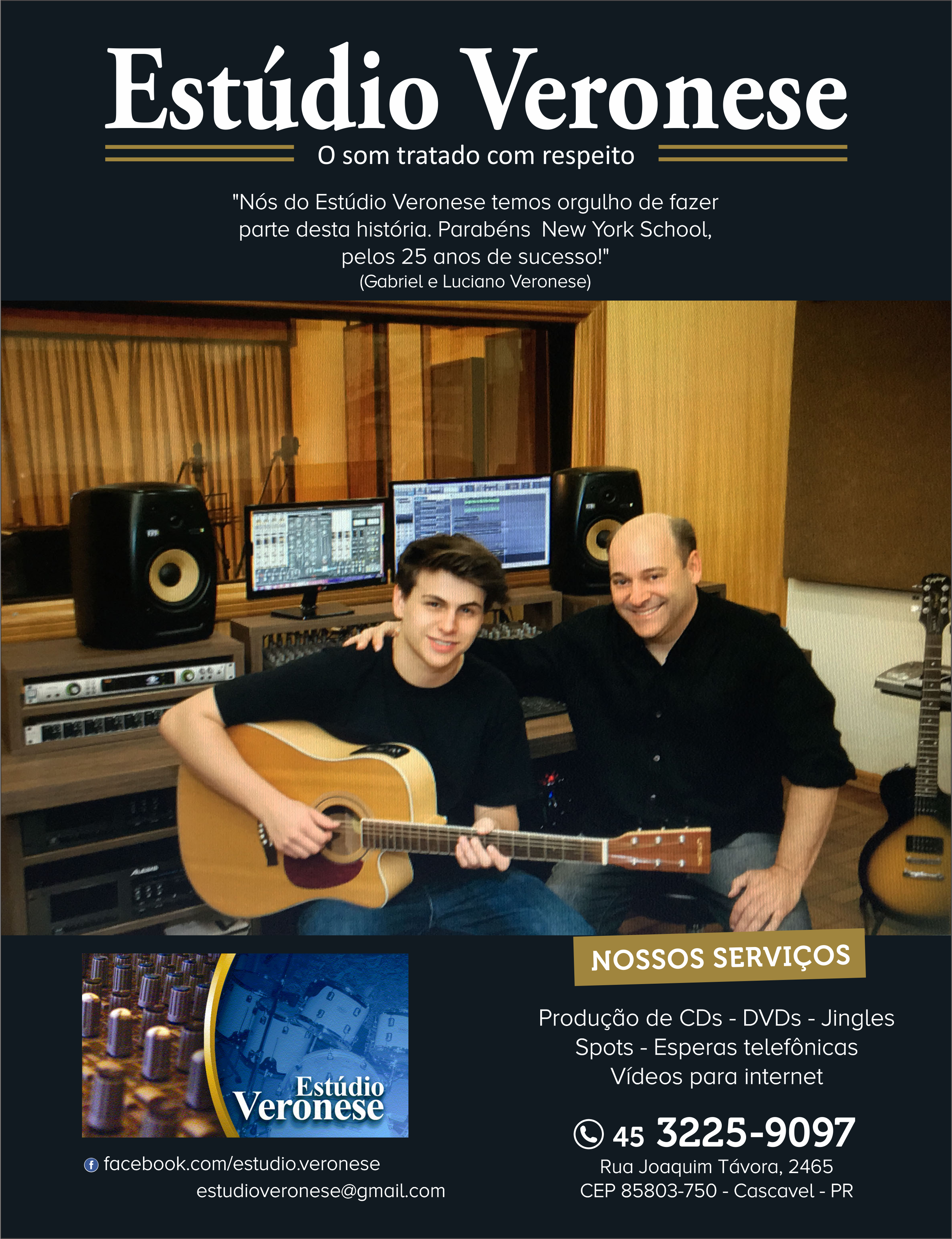 Proprietário do Estúdio Veronese, Luciano, com seu talento ímpar, criou o super conhecido jingle da escola: “New York School, um jeito fácil de aprender inglês [...]”. Ouça no player acima.